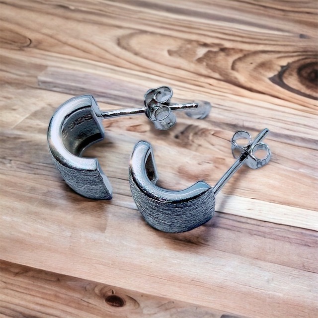 まるで夜空に浮かぶ半月のように、存在感のあるピアスです。 月を形作ってみました。 材質:silver925 サイズ:約9.8×9㎜ 品番:P-003 付属品:専用BOX 【注意事項】・・・ご購入前には必ずプロフィールをお読みください。 ※シルバーのくすみが気になる場合は、シルバー用クリーナー液をお使いください。 ※使用後は柔らかい布で軽く拭くことをおすすめします。 ※作品は、どれも丁寧に彫金して制作しておりますが、サイズ表記につきましては多少の誤差が出てしまうことがございます。また、写真と全く一緒ということではございません。あらかじめご了承ください。 ※装着後のご返品には応じておりませんのでご注意ください。